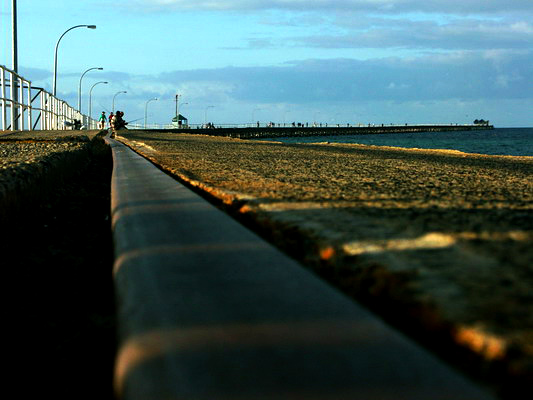 Letztes Ziel auf unserer Reise vor dem Rückweg, die 2km lange Jetty in Busselton. Wegen des flachen Ufers müssen Schiffe weit draußen entladen werden.