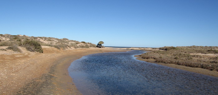 Der nächste Morgen entlohnt dann für die Strapazen des Vortrages - wir haben den ganzen Strand und auch einen kleinen Fluss für uns.