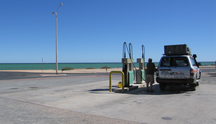 Jetzt bekommt auch unser durstiges Kamel Frühstück. 140l Diesel kann es auf einmal zu sich nehmen. Wir hatten schon schlechtere Aussichten beim Tanken, Ozeanufer gibt es hier genug.