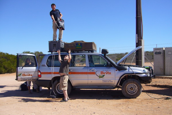 Und auch Wasser wird getankt, schliesslich geht es jetzt weit ab von Zivilisation. 40l fasst der Wassertank unter dem Auto, noch mal 20l gehen in unsere Campingdusche.